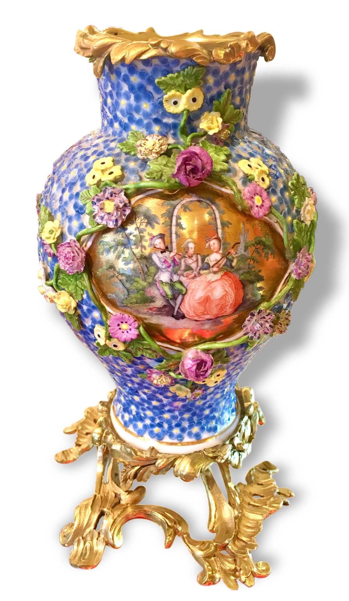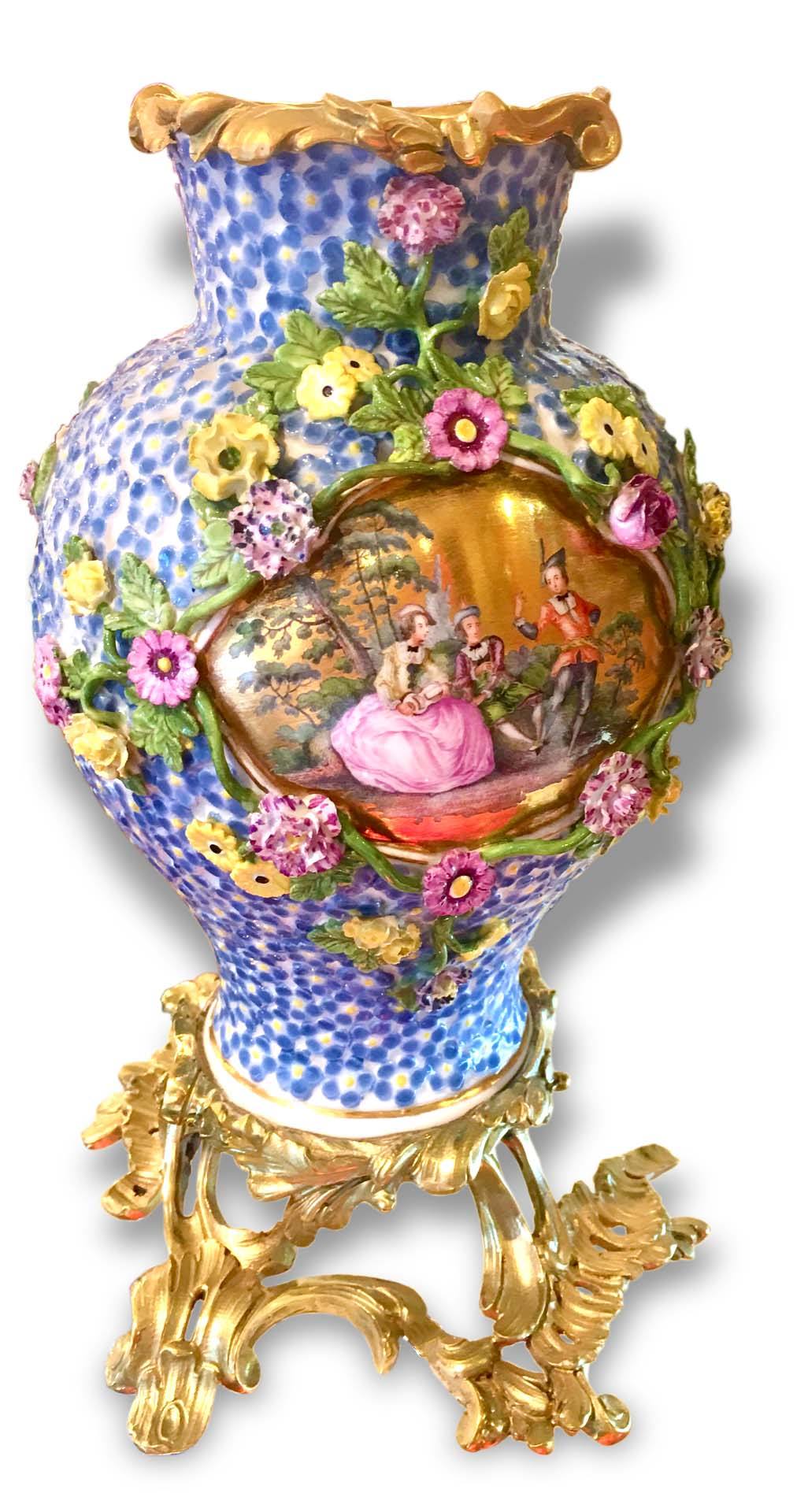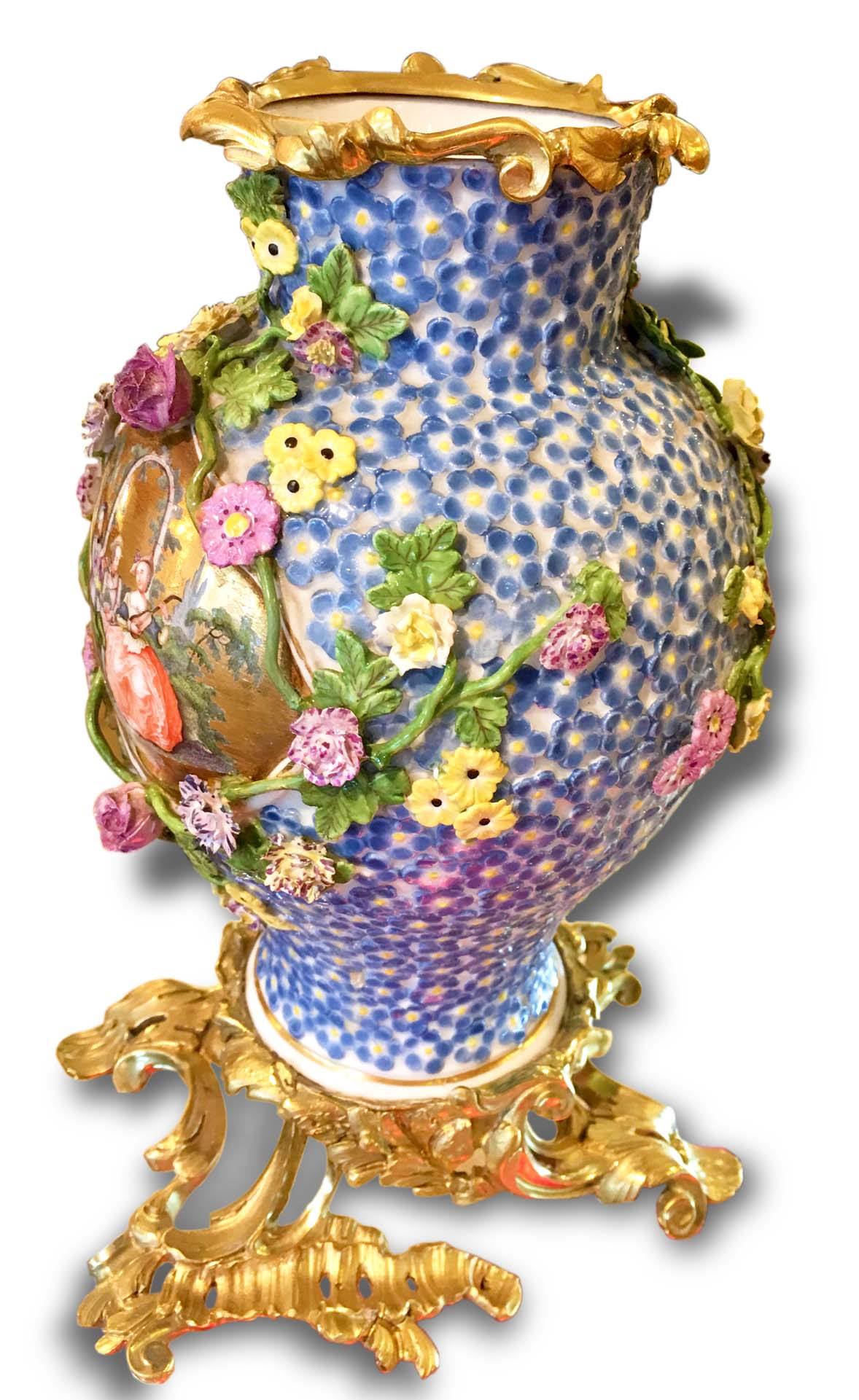 Meissen窯廠代表著歐洲瓷器的起源,Meissen的瓷器中所有重要的收藏等同於歐陸瓷器發展的里程碑。這邊要跟各位介紹的是Meissen少數結合鎏金製作的特殊訂製品,其特徵除了銅鎏金的外部裝飾結構外,最明顯的是包覆整個瓶身外觀的,一種在德國五月盛開的鮮花-勿忘我(Maiblumen)。這一系列的作品通常以洛可可時期最具代表性畫家-華鐸的作畫風格來裝飾瓶身主題,多數採單面作畫但亦有少部分特殊訂製品採雙面繪製。鎏金裝飾的部分爲路易十五的花卉捲軸,腳上裝飾著大型捲葉子。