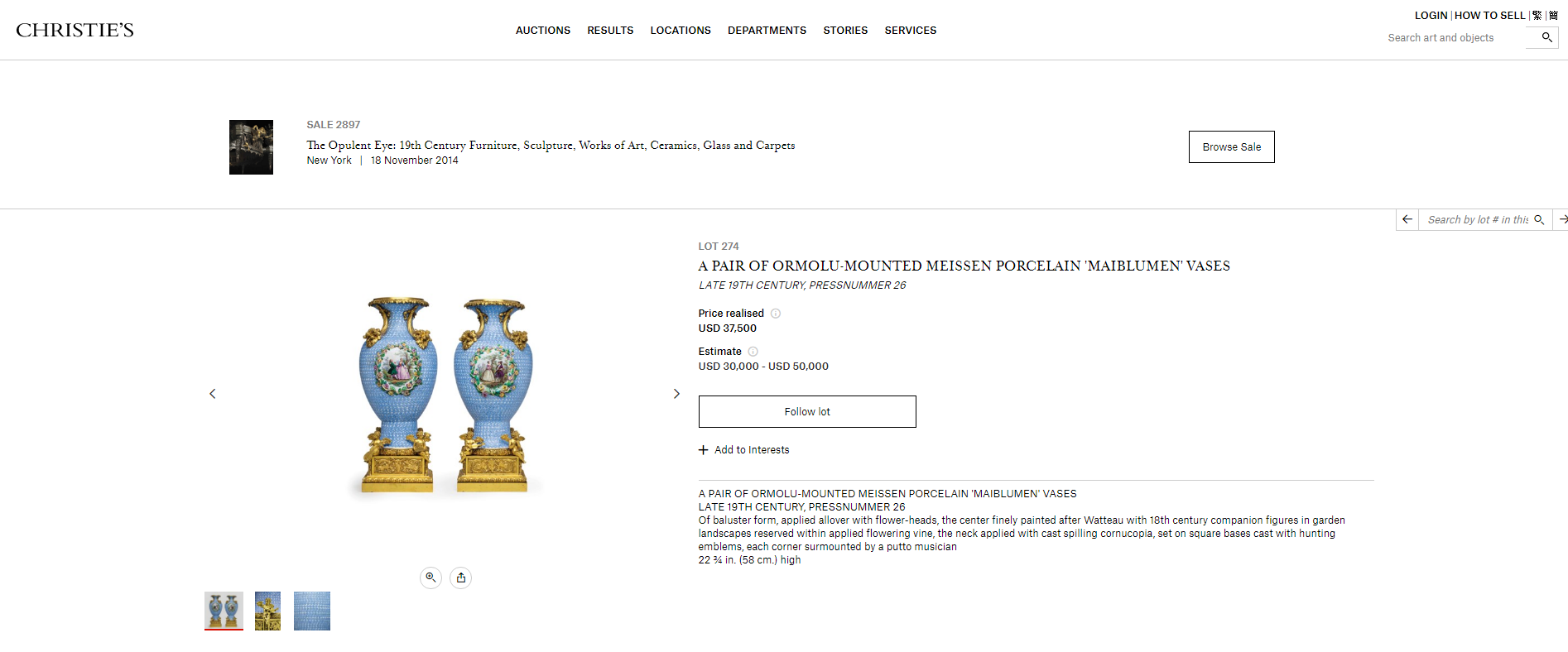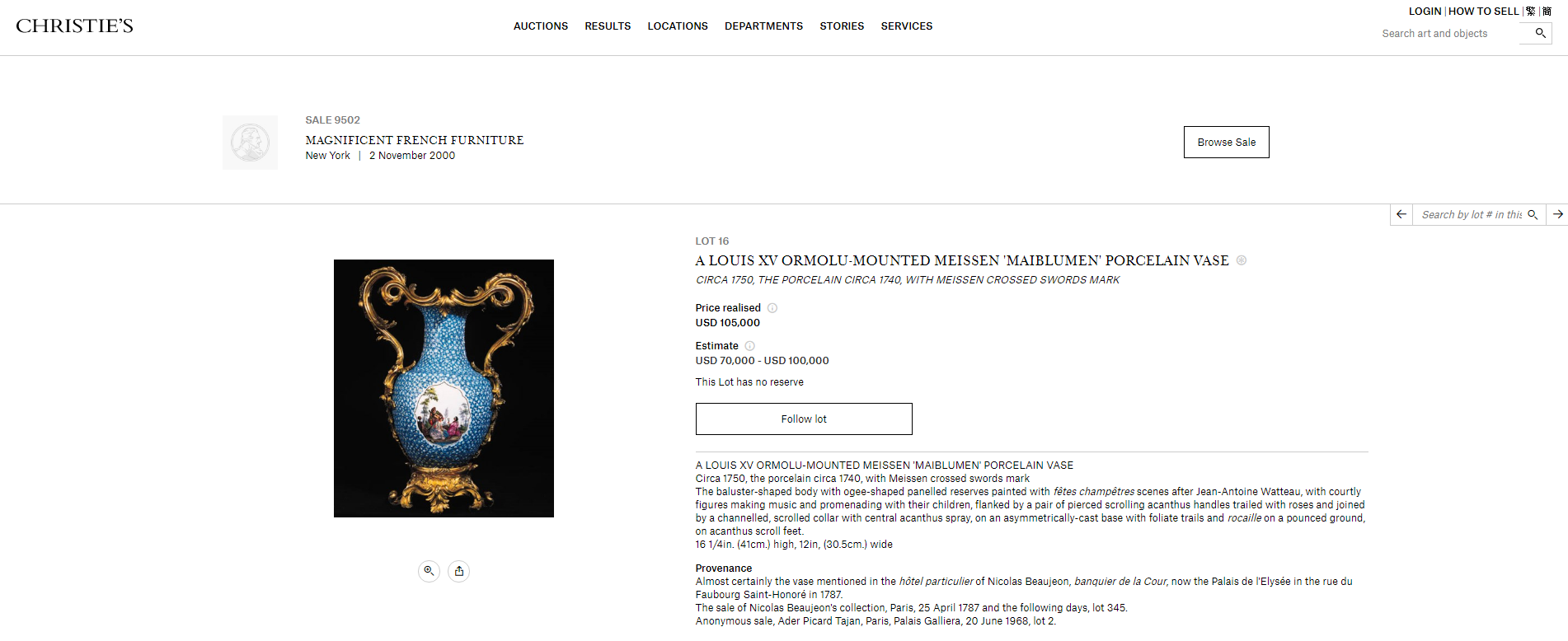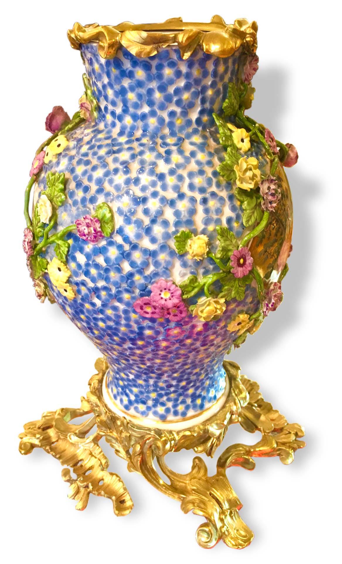 Meissen窯廠代表著歐洲瓷器的起源,Meissen的瓷器中所有重要的收藏等同於歐陸瓷器發展的里程碑。這邊要跟各位介紹的是Meissen少數結合鎏金製作的特殊訂製品,其特徵除了銅鎏金的外部裝飾結構外,最明顯的是包覆整個瓶身外觀的,一種在德國五月盛開的鮮花-勿忘我(Maiblumen)。這一系列的作品通常以洛可可時期最具代表性畫家-華鐸的作畫風格來裝飾瓶身主題,多數採單面作畫但亦有少部分特殊訂製品採雙面繪製。鎏金裝飾的部分爲路易十五的花卉捲軸,腳上裝飾著大型捲葉子。