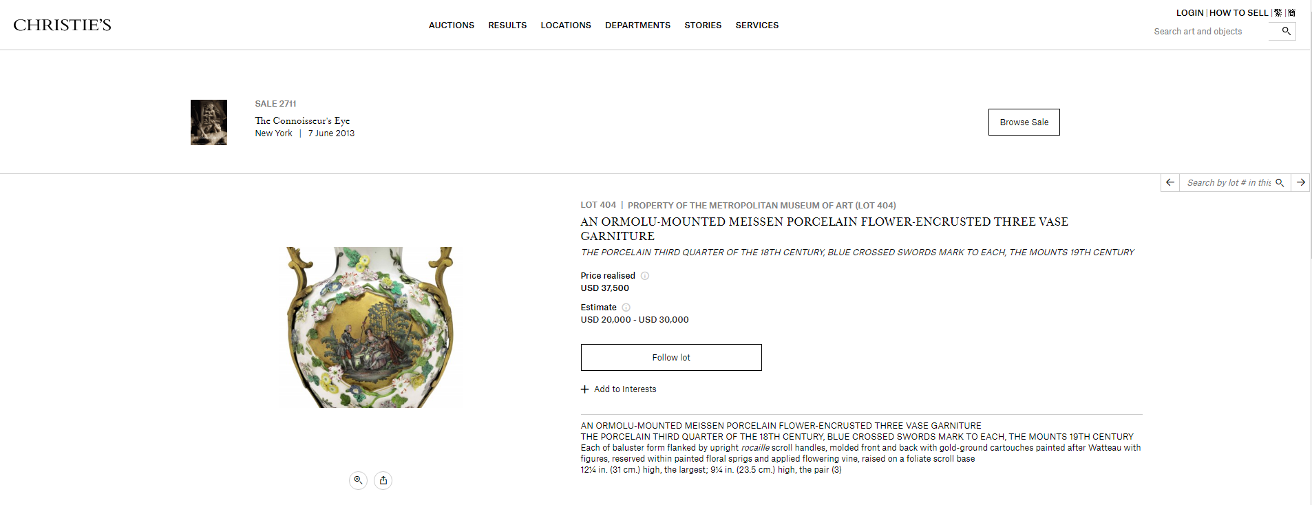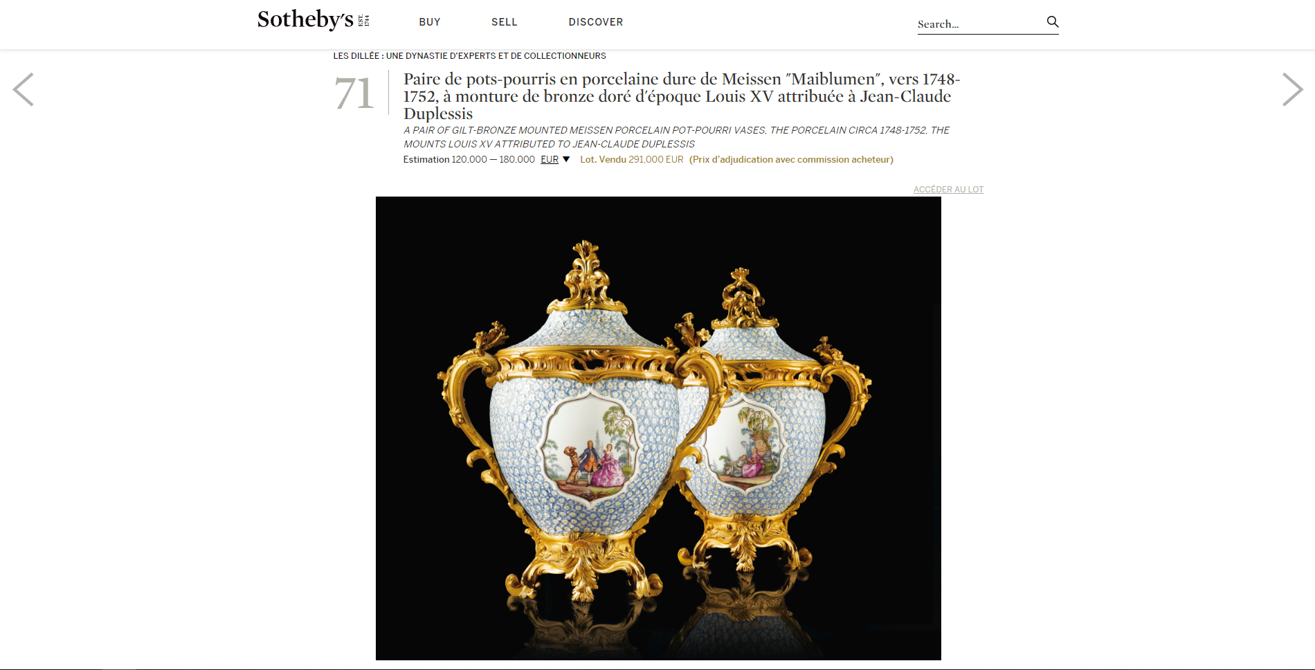 其中一對花器目前保存在巴黎羅浮宮(Charles Heine遺產)。轉載於蓬巴杜夫人和藝術,展覽目錄,凡爾賽2002,201。
