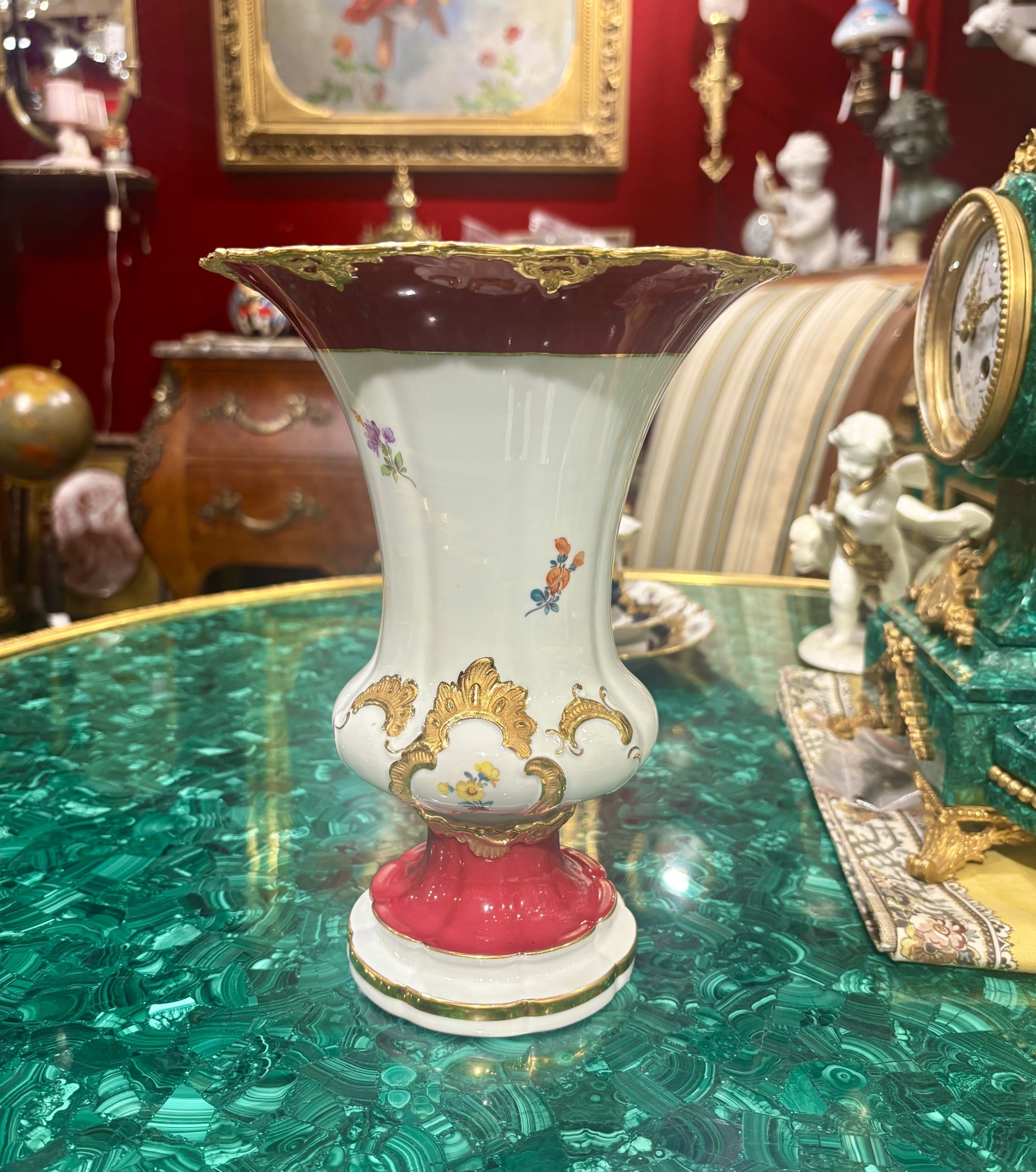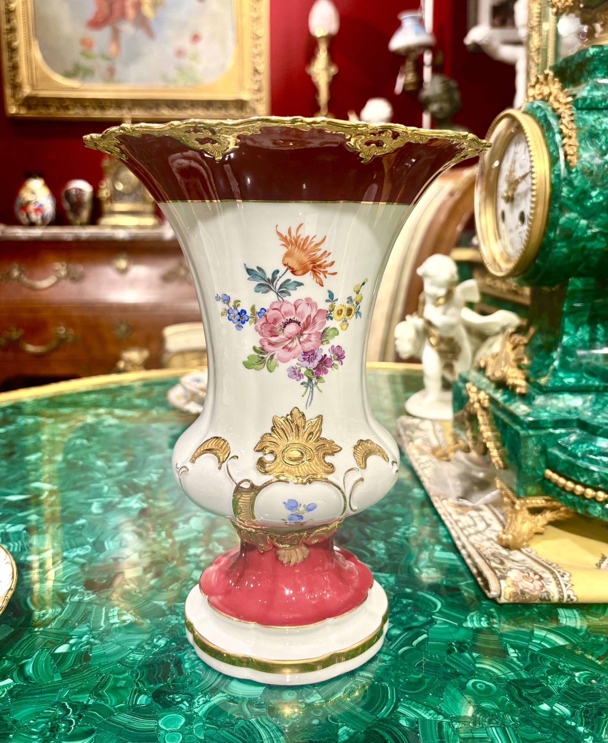 上面的富貴紅與金色的組合可以看出其中明顯的洛可可風格元素,不得不歸功於Johann Gregor Höroldt 1696–1775。麥森歷史上最重要的畫家之一,他將瓷器從單一的藍白釉色帶入了多色釉彩的時代。確立了邁森著名的釉上彩 (Enamel Painting) 體系,包括許多精緻的紅色、紫色和金色裝飾。創造了霍洛爾特式中國風以及許多花卉邊飾。