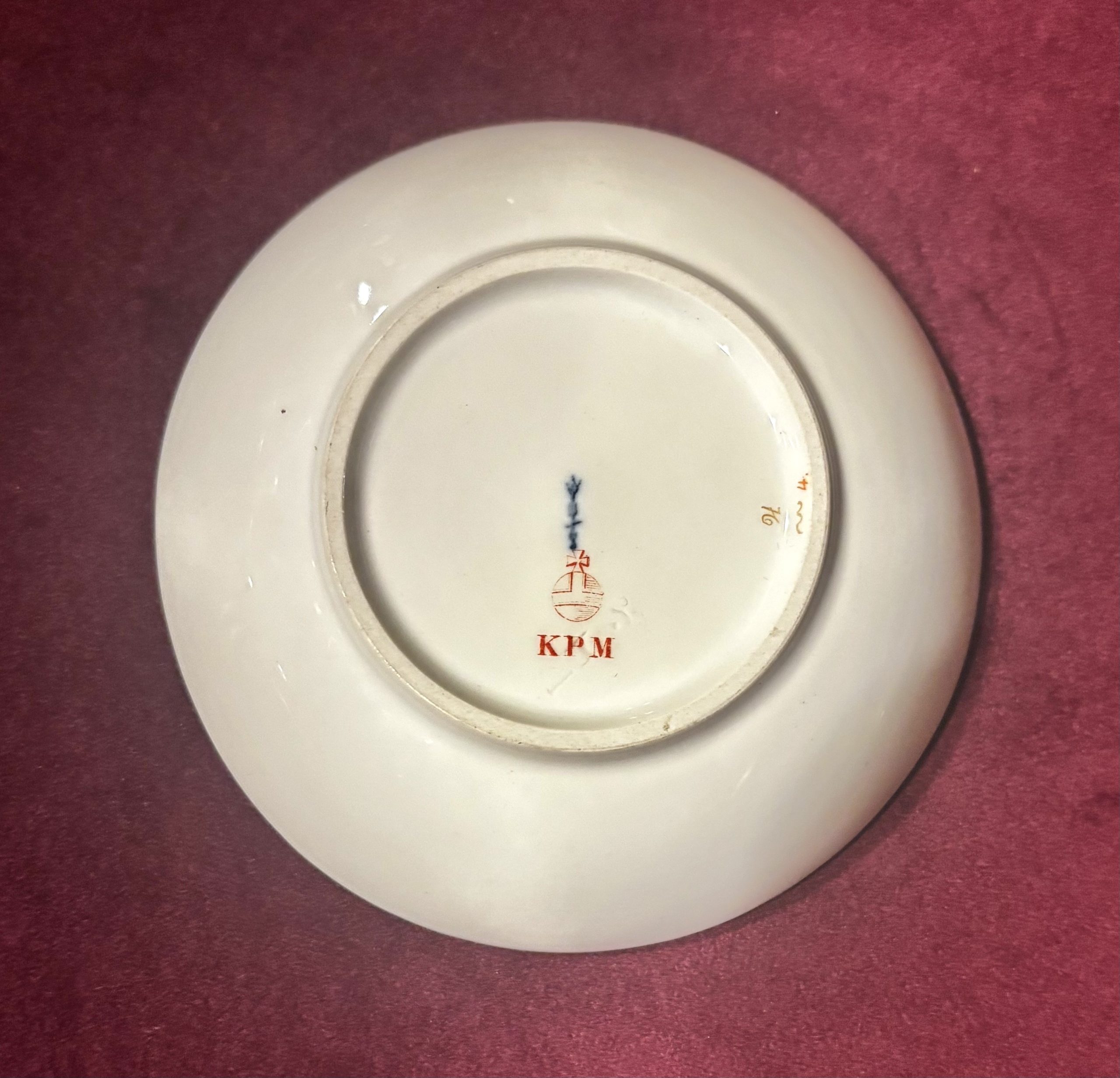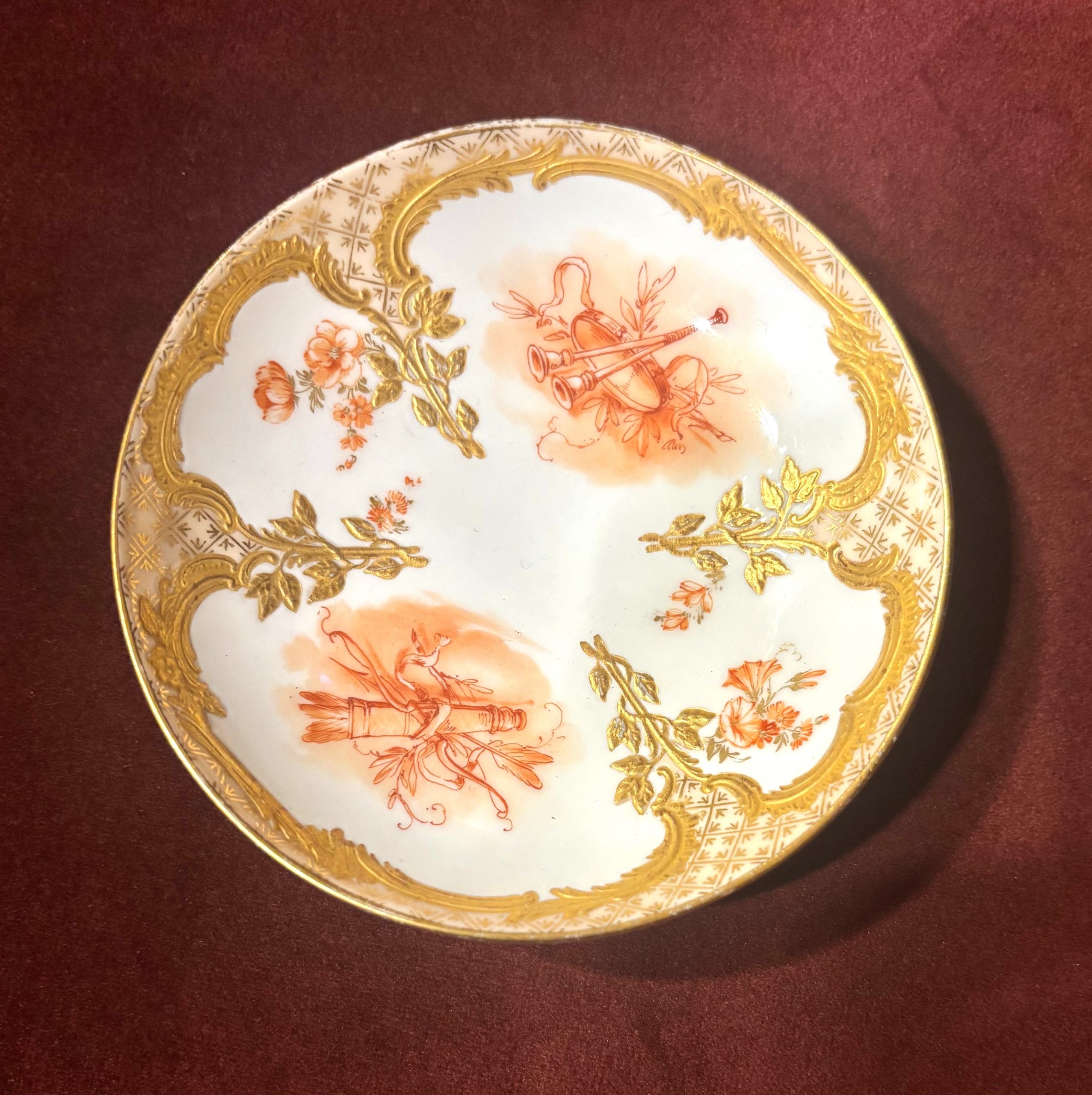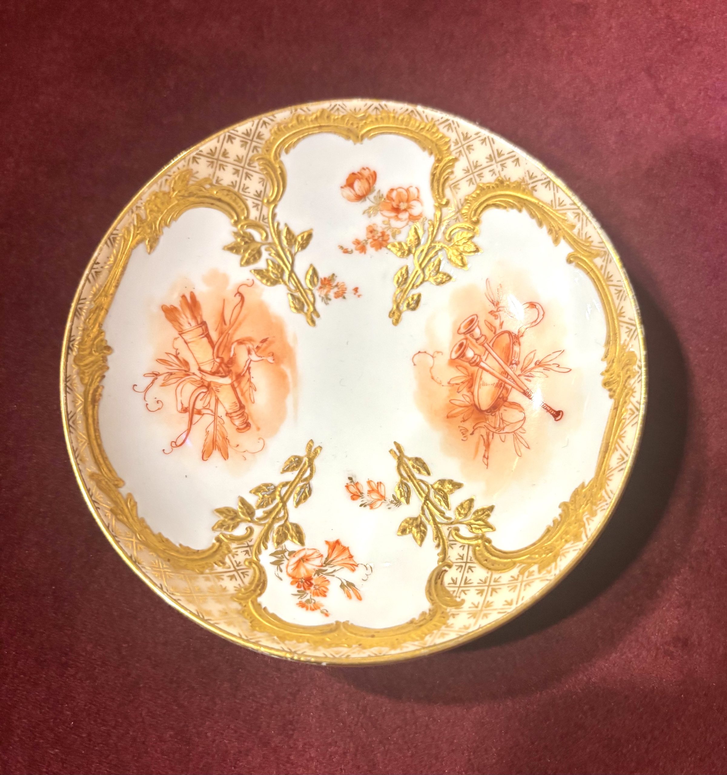 華麗的鎏金邊飾: 邊緣繪製有厚重的金色渦卷形和花葉飾,呈現出典型的洛可可風格不對稱和曲線美。獎盃圖案(Trophy)由樂器、軍械或園藝工具等組合而成的裝飾,是 18 世紀中期至晚期,即路易十六時期歐洲裝飾藝術中的經典主題。