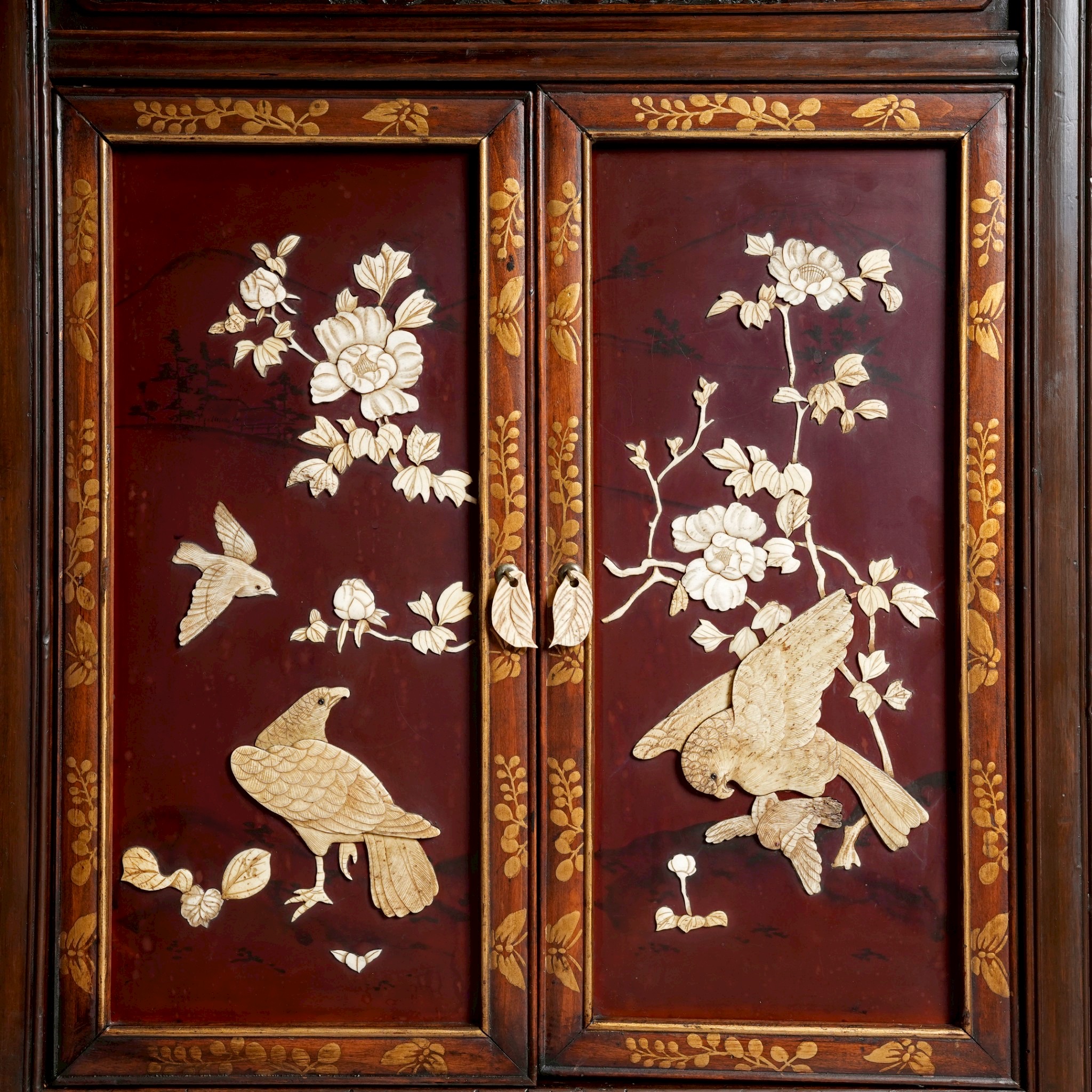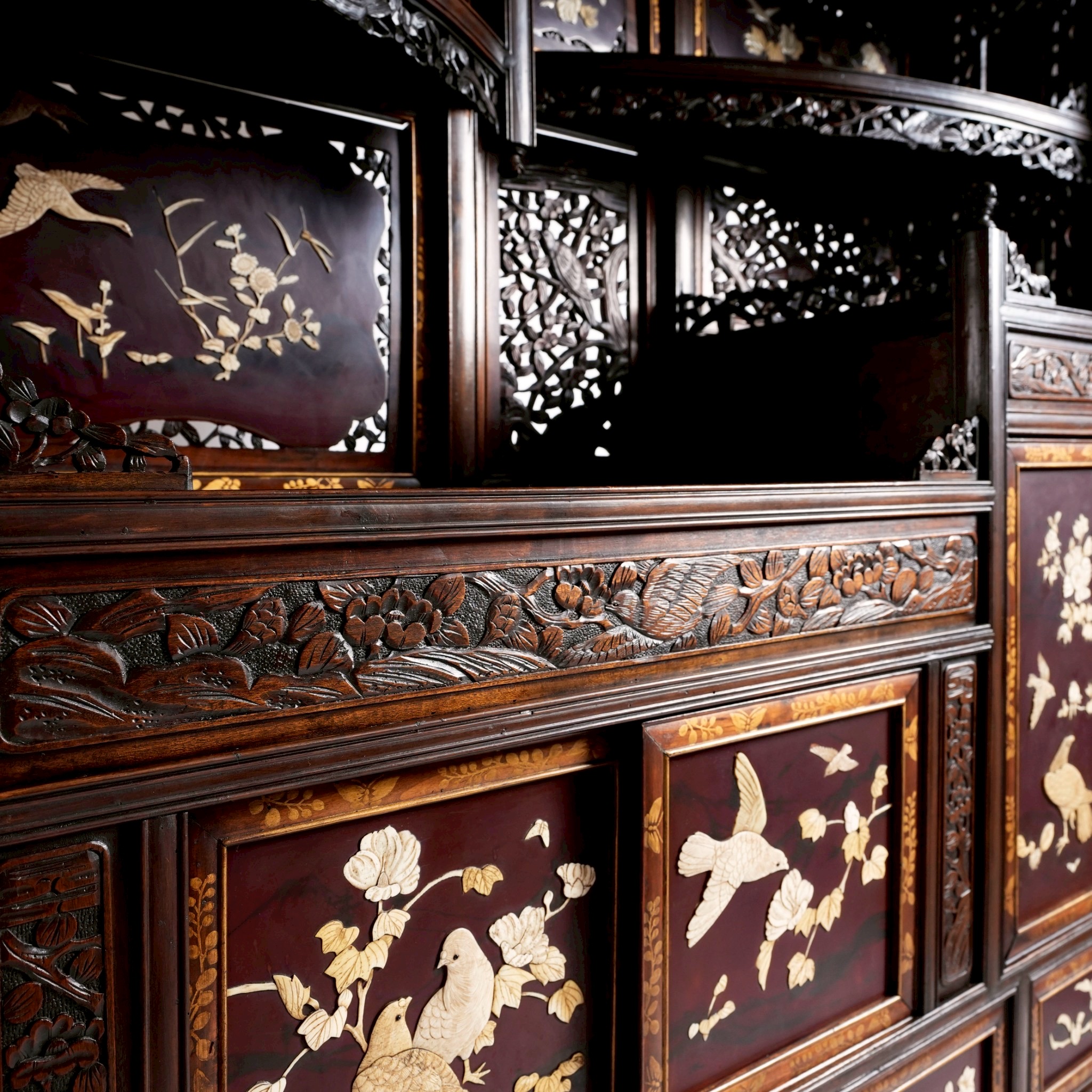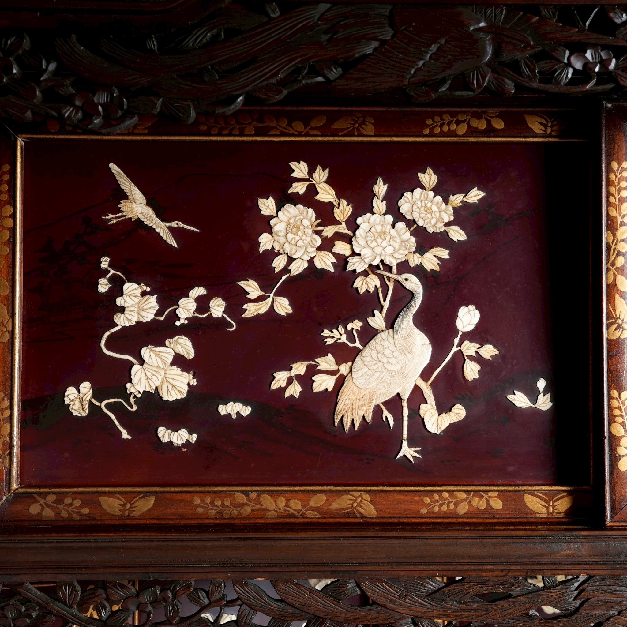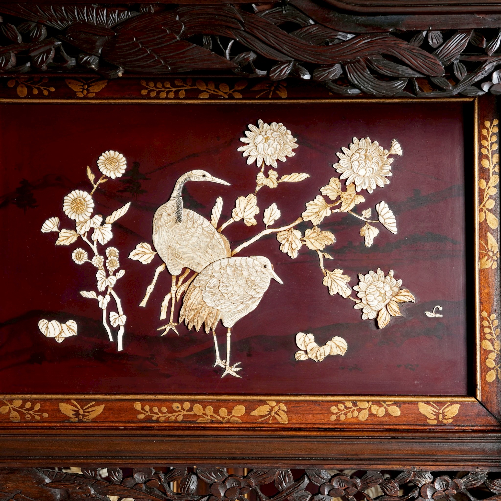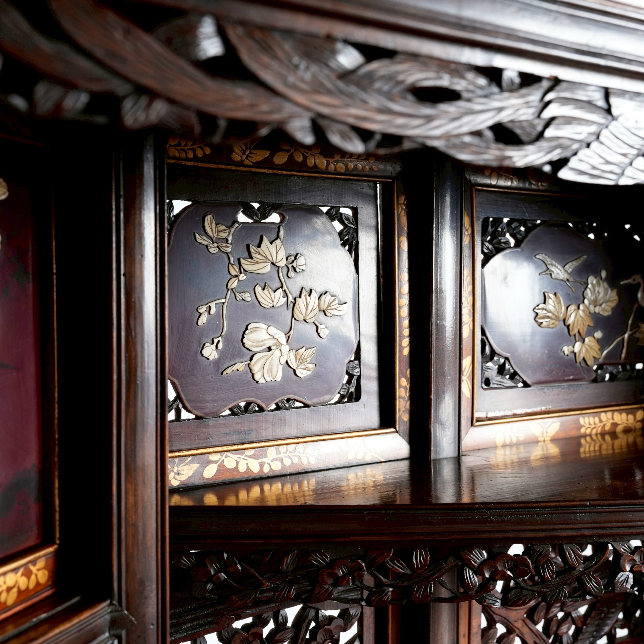 櫃體頂端巨大的圓雕鷹,明治時期鷹不僅象徵著武士階級的勇猛,更是當時歐美藏家最推崇的日本符號,象徵著「力量」與「遠見」。另外松、鶴、牡丹的組合代表「松鶴遐齡」與「富貴長青」。與一般的平貼螺鈿不同,櫃中圖樣花鳥畫工序繁複,是先將象牙雕刻成三維形狀後,再嵌入黑檀木中,形成極強的視覺對比。除了精緻的芝山細工裝飾面板,有些是帶有精細鏤空雕刻的背板。這些開放與封閉的區塊在左右分布上呈現奇數或交錯配置,而非傳統西式家具的對稱軸設計。每一片面板上的花鳥構圖都是獨立的,它們在主題上呼應,但在構圖上完全不同,創造出一種如自然景觀般的自然流動感。在日本審美中,完美的對稱往往被視為「靜止」且「缺乏生命力」的。這種不對稱設計是為了模仿自然的隨機美,並引導觀者的視線在櫃體上不斷移動,從而發現每一處隱藏的精緻細節。