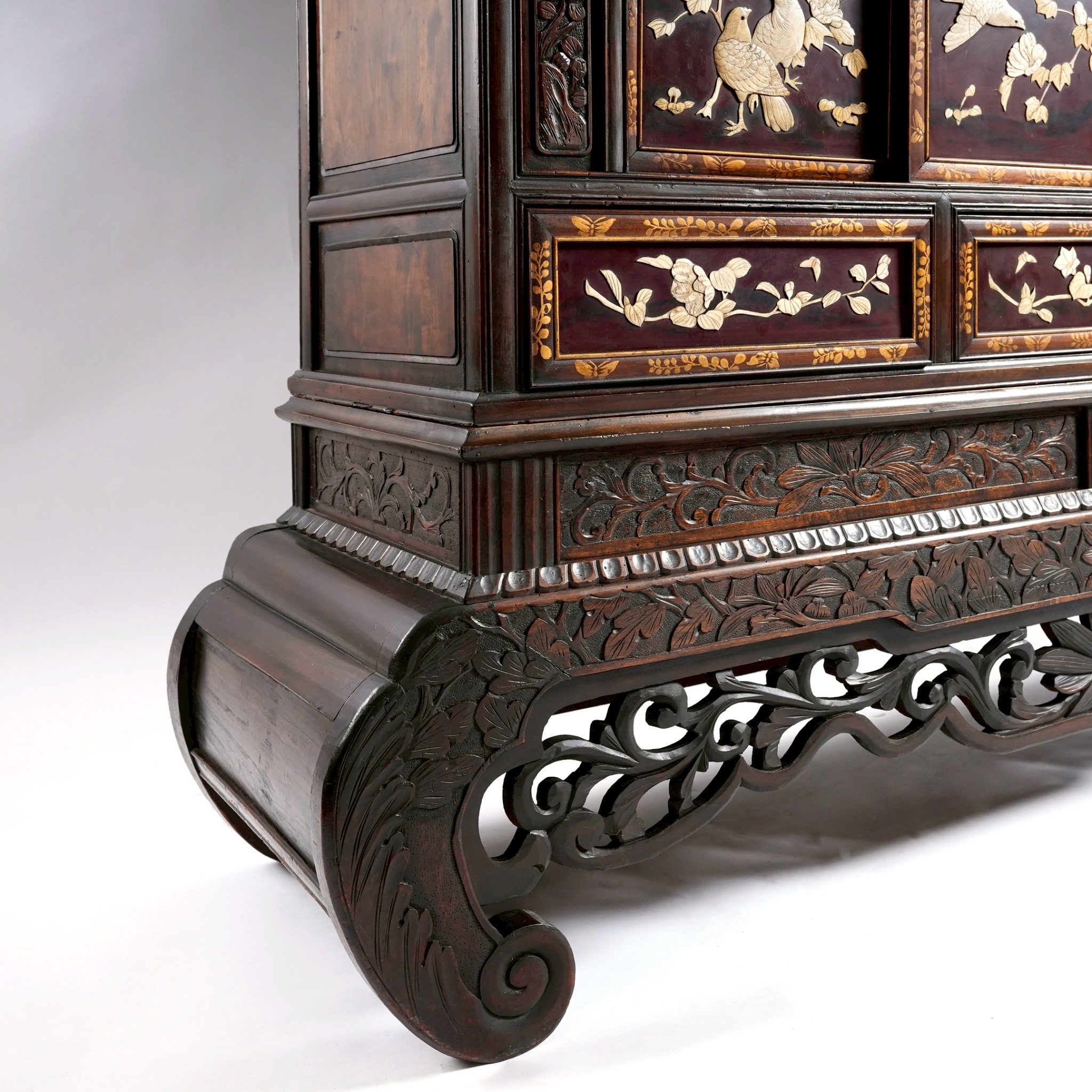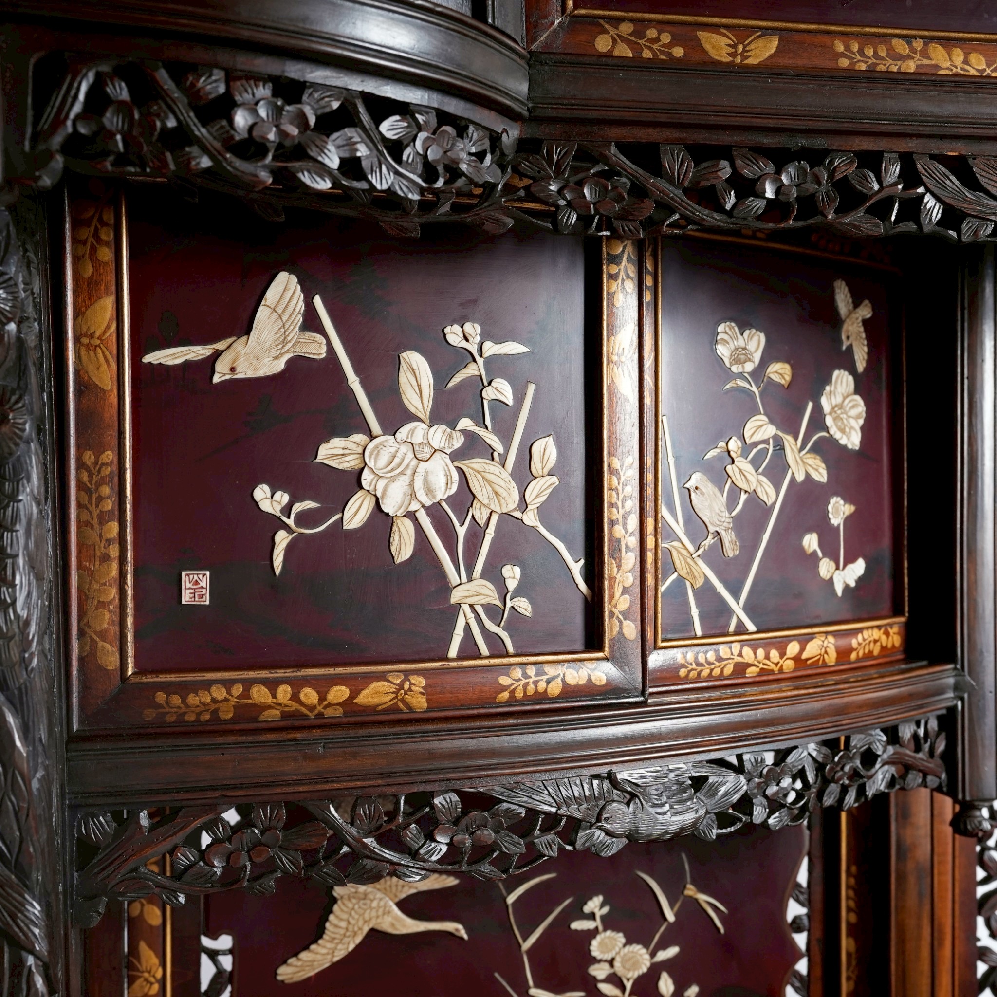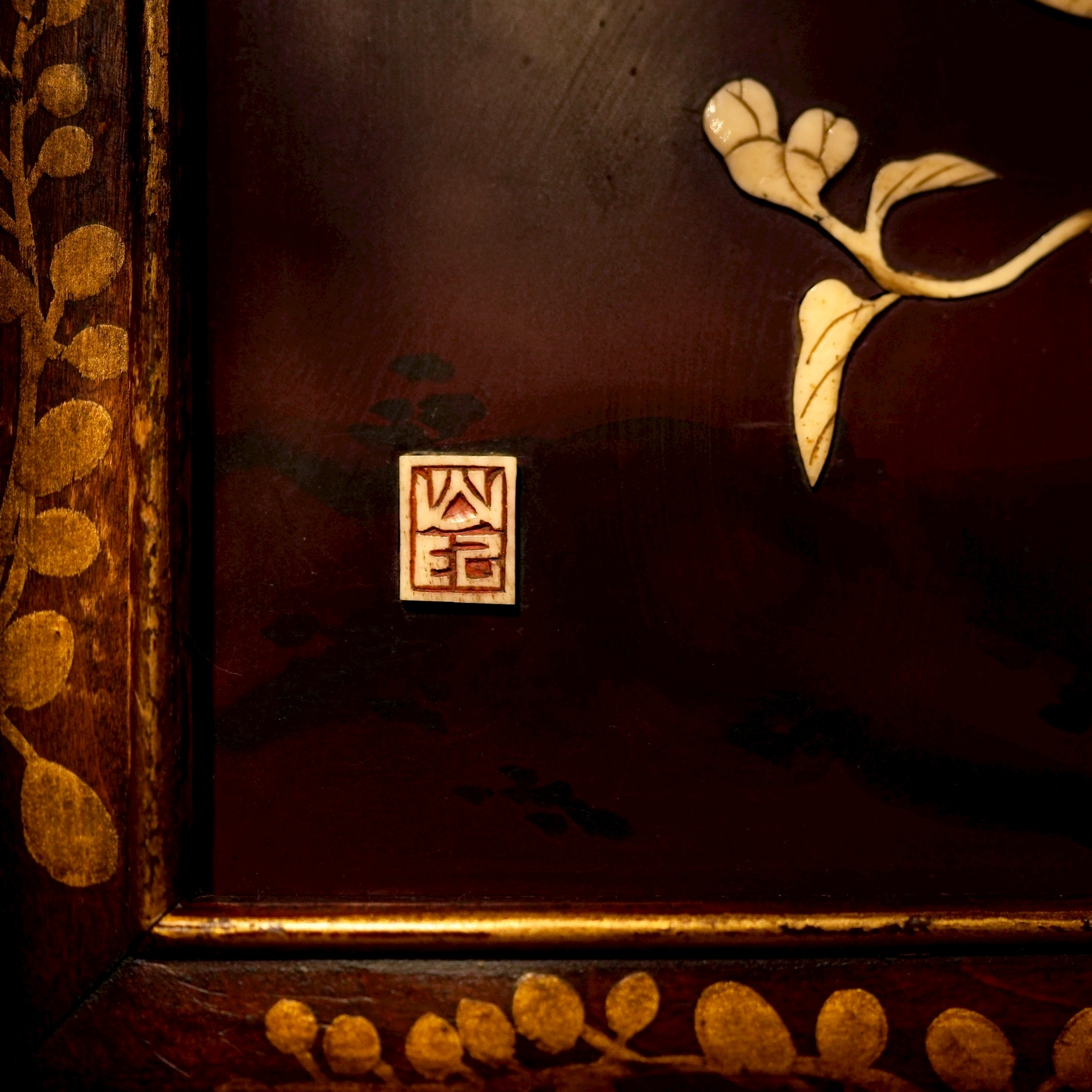 這座櫃子最核心的藝術價值在於其芝山鑲嵌(Shibayama Inlay)。Shibayama 又稱芝山鑲嵌細工,是一種類似於馬賽克的鑲嵌工法,被運用來裝飾印籠(印龍,顧名思義是裝印章、印泥的小盒子,原本是書齋中的擺件。後來武士、商人們外出時將它掛在腰間隨身攜帶,裡面除了印章還裝些備用藥物等)、花器、桌上屏風、香薰台、象牙藝品、飾板