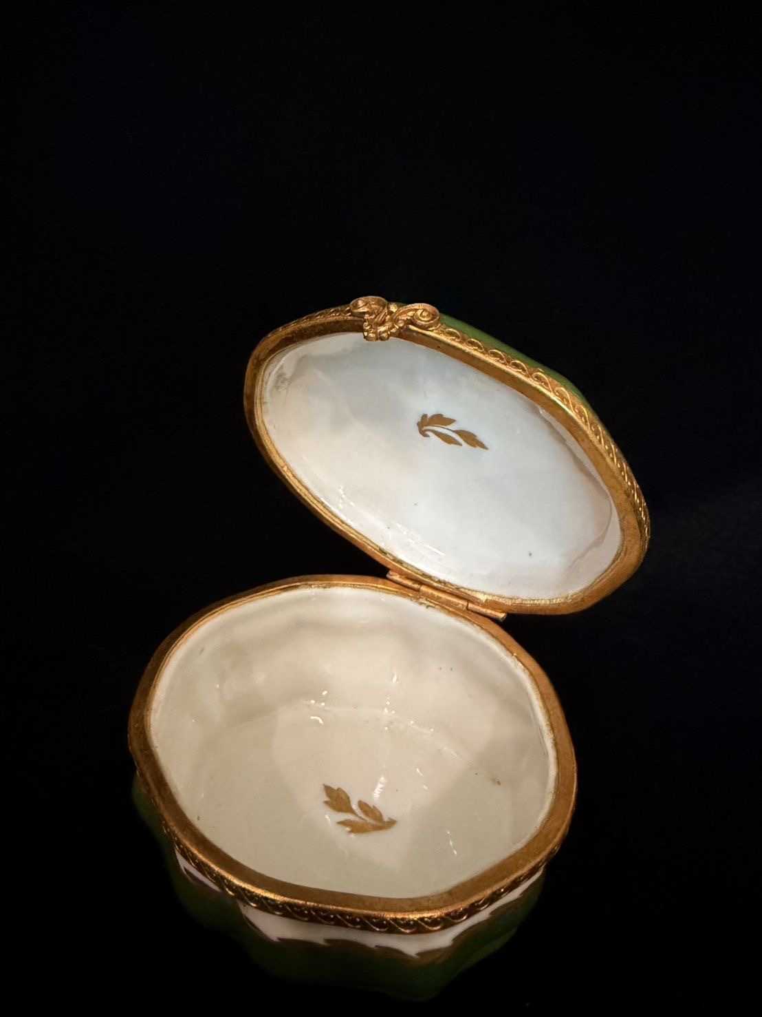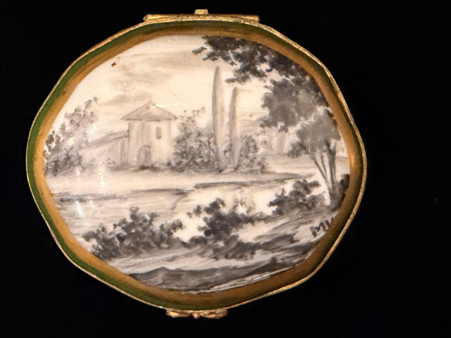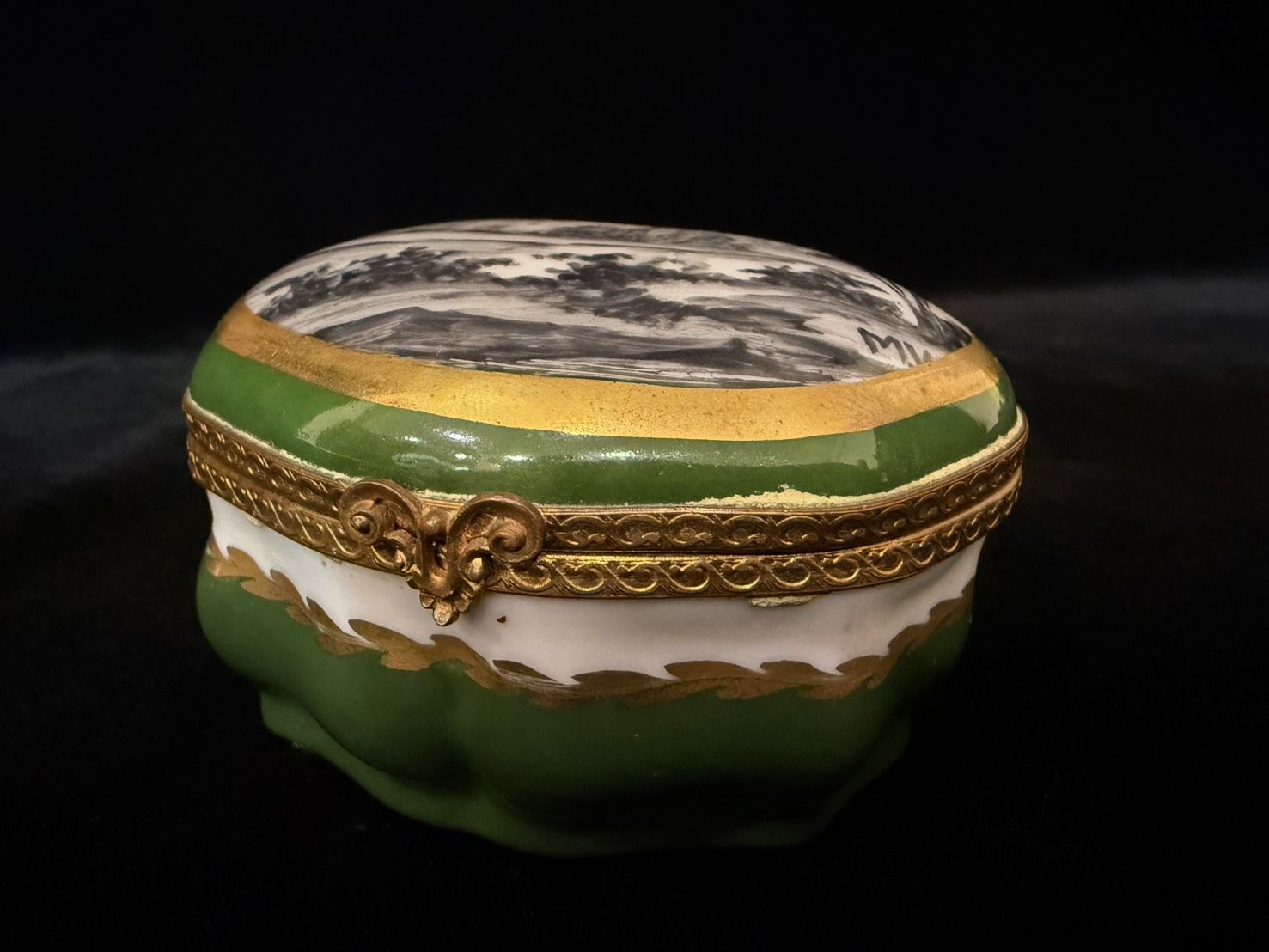 盒面以黑白風景畫為主題,盒身以濃郁的綠色釉料為主,並搭配大量的鍍金裝飾細節,包括環繞邊緣的波浪紋和底部的葉狀圖案。這種綠色與金色相配的風格體現了古典法國的奢華與優雅。