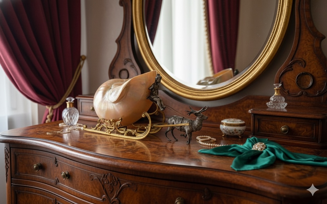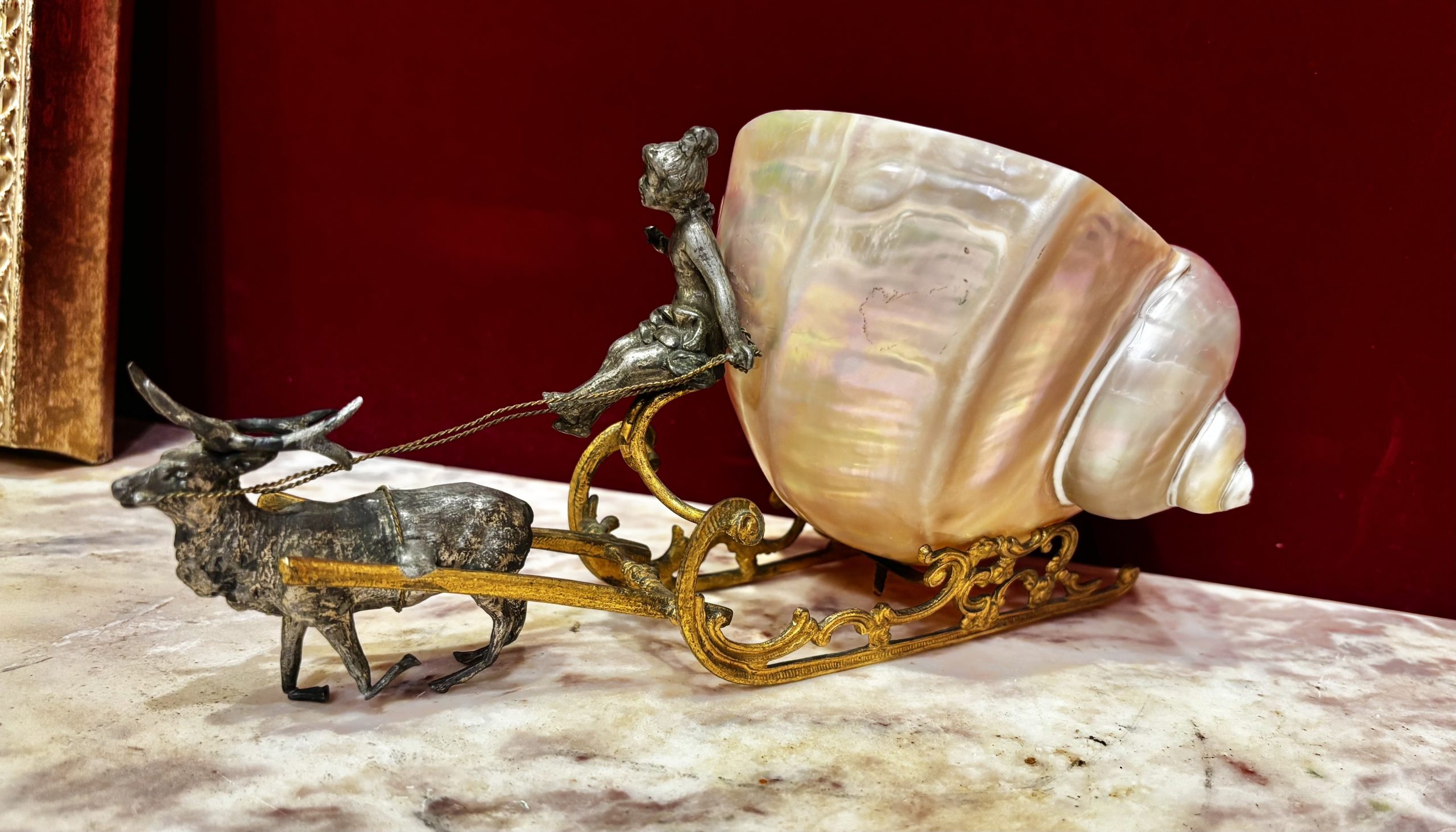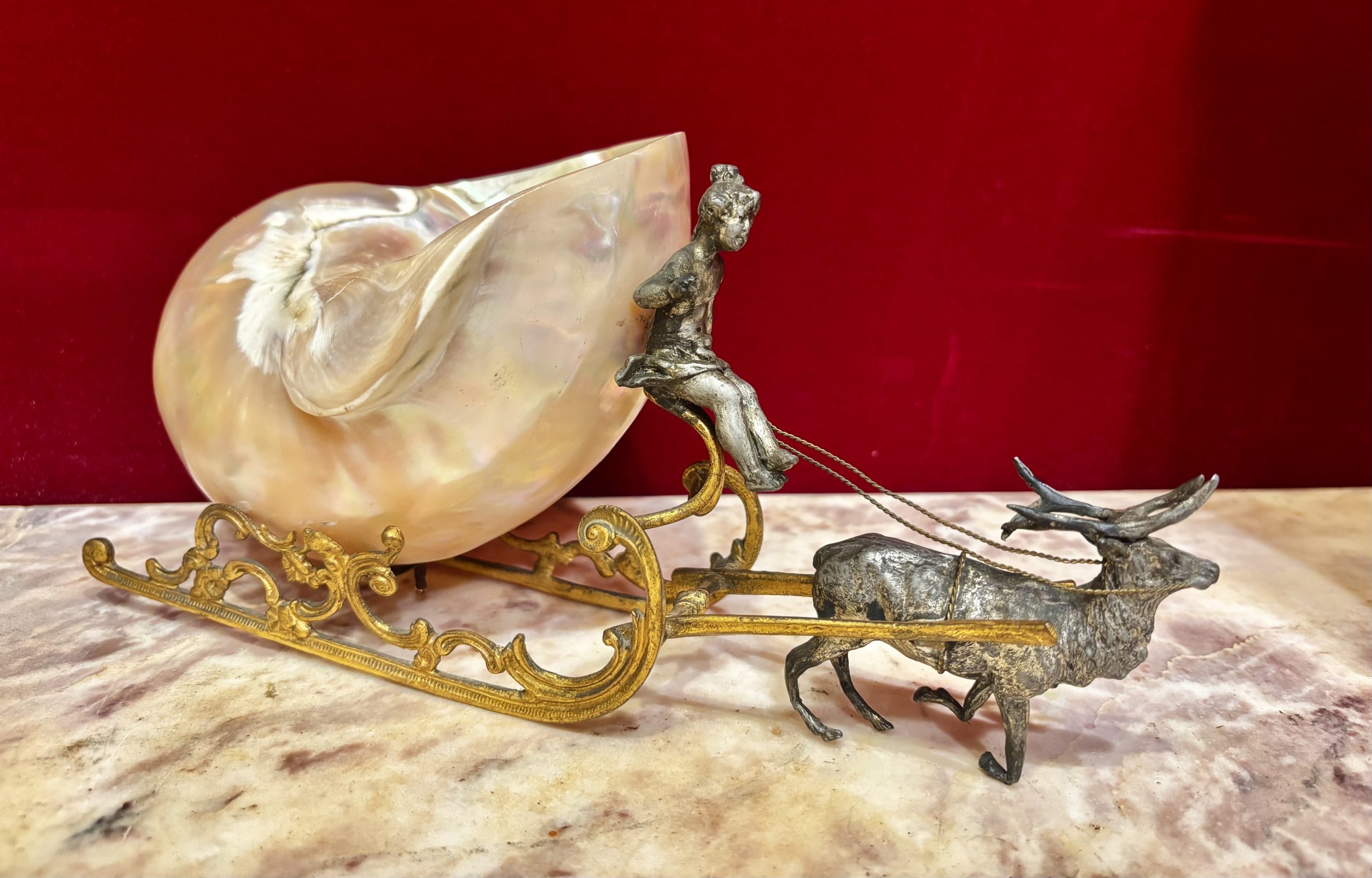 維多利亞時代晚期至新藝術運動早期(約 19 世紀末至 20 世紀初)的歐洲裝飾擺件,風格屬於維多利亞裝飾藝術 (Victorian Decorative Arts),由天然鸚鵡螺殼(作為雪橇車身)和金屬(黃銅/鍍金底座與銀/白鑞人物和馴鹿)組合而成,可放置在壁爐架、展示櫃或桌面上,主要用途是裝飾擺設 (Decorative Ornament/Object),用來展示主人的品味和財富。