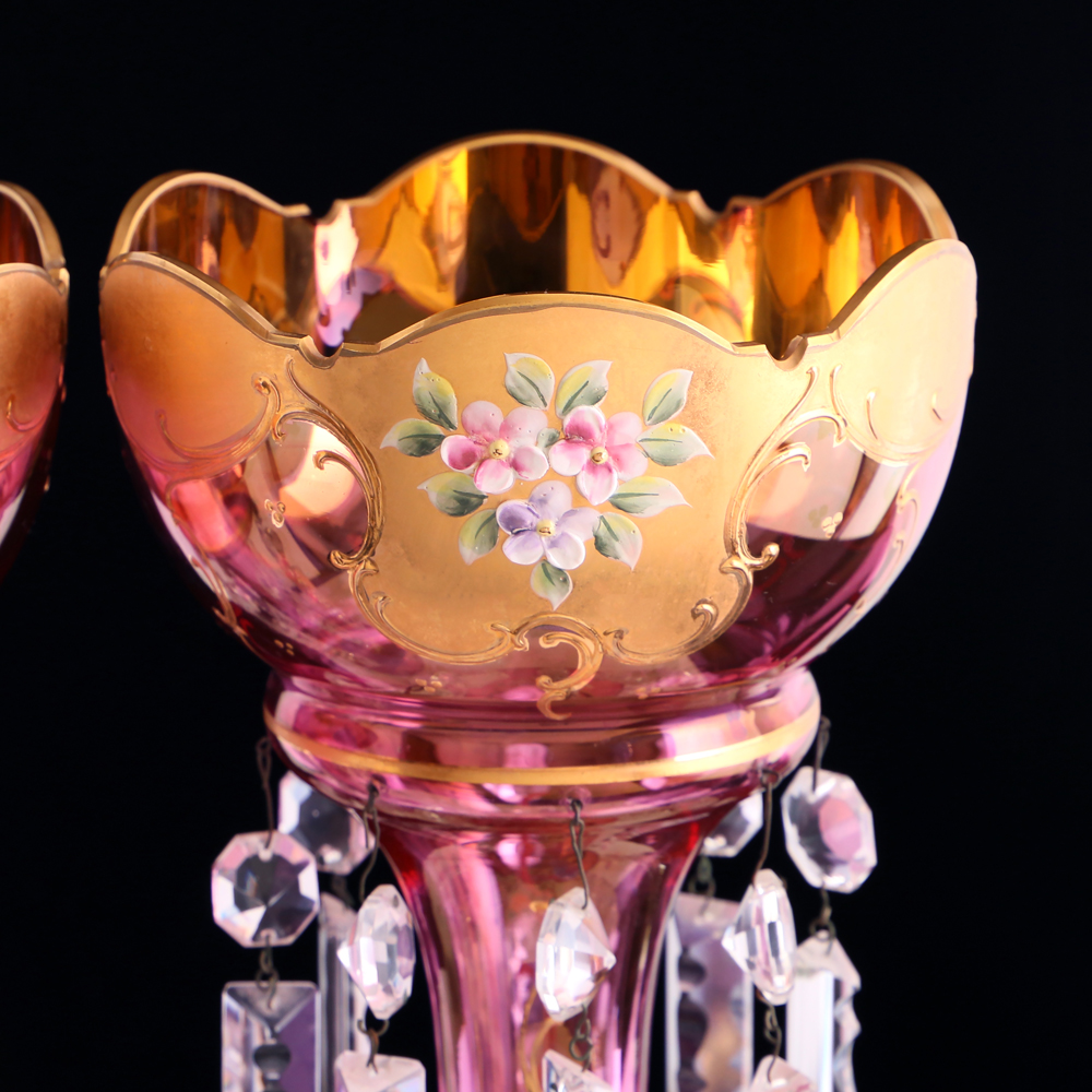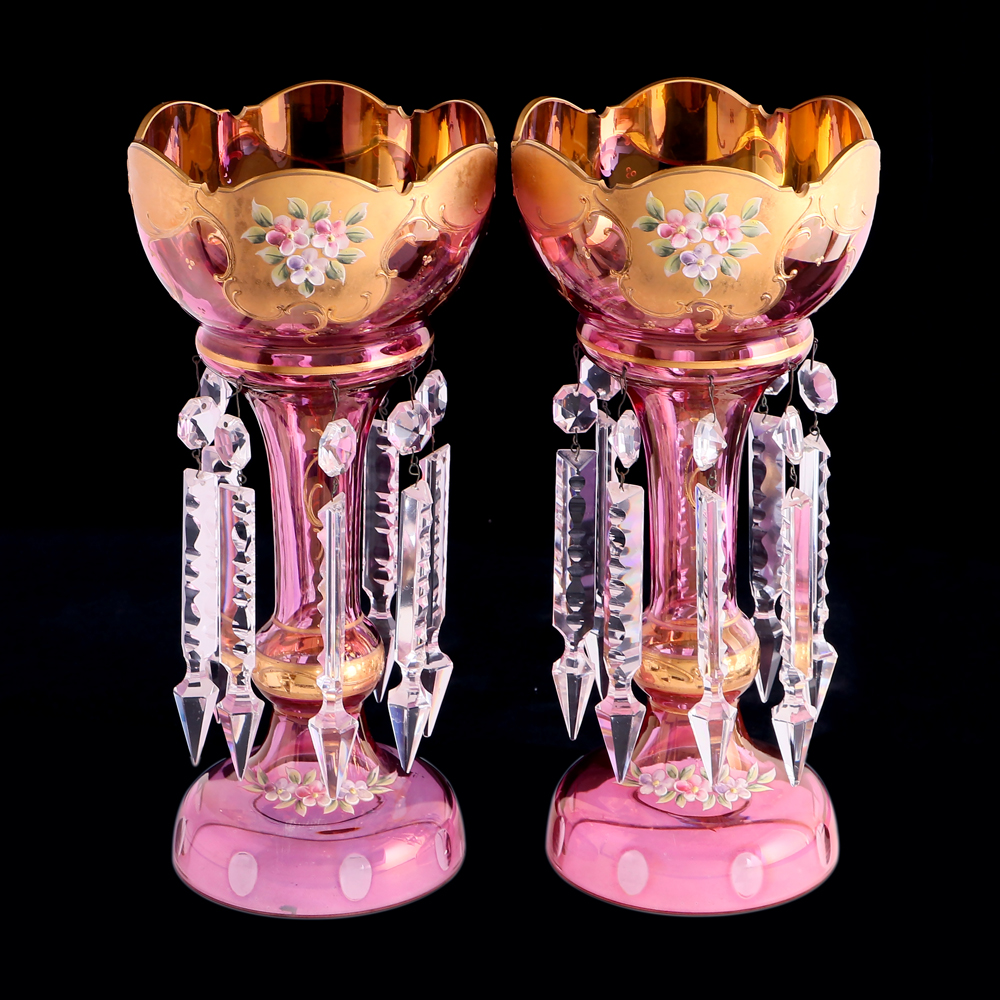 說明:這種物件的英文名稱是mantle lusters,有不同的顏色和裝飾花紋,不過通常都是一對,而且旁邊都有柱狀水晶裝飾且帶有華麗感