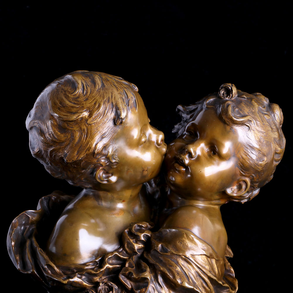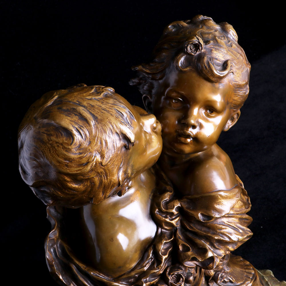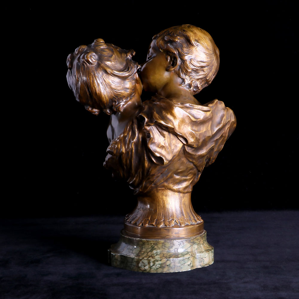 這座半身銅雕最為迷人之處在於其將觀者的視線聚焦於小男孩親吻小女孩臉頰,這天真無邪的一刻化剎那為永恆。Auguste Moreau最為人所讚道的即是他運用銅如此剛硬的材質,完美的詮釋許多溫柔的題材,兒童豐潤的臉頰、有神的雙眸和生動的神情,因為他的巧手而注入無限的生命力,藝術家所詮釋的瞬間,彷彿透過這件作品,靈巧地勾勒起我們記憶深處的童年,是如此純粹而美好!