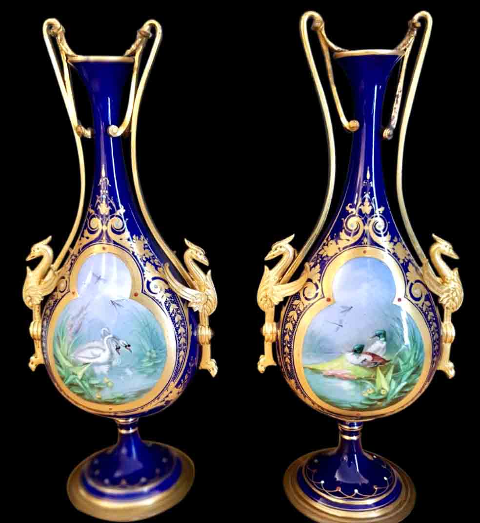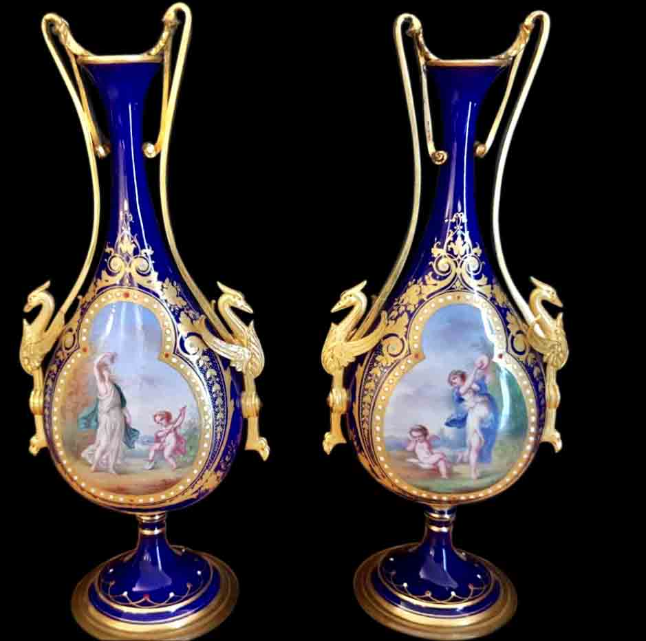 Sèvres賽佛爾蛇頸琺瑯珠點鎏金鳳凰花器一對