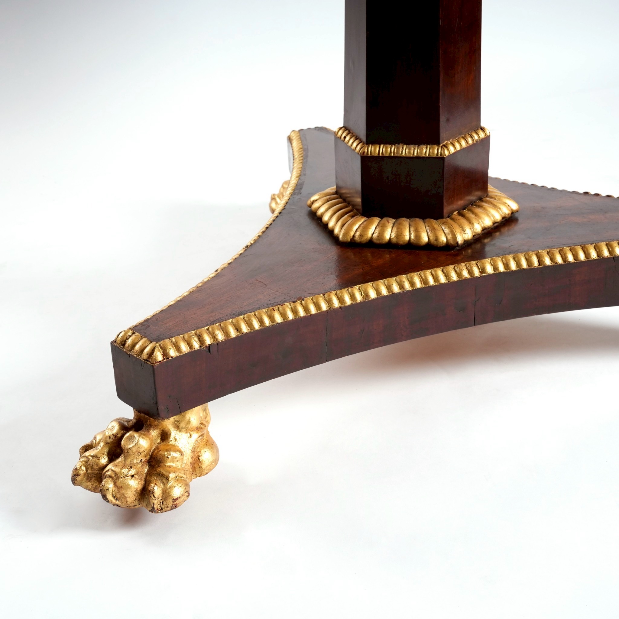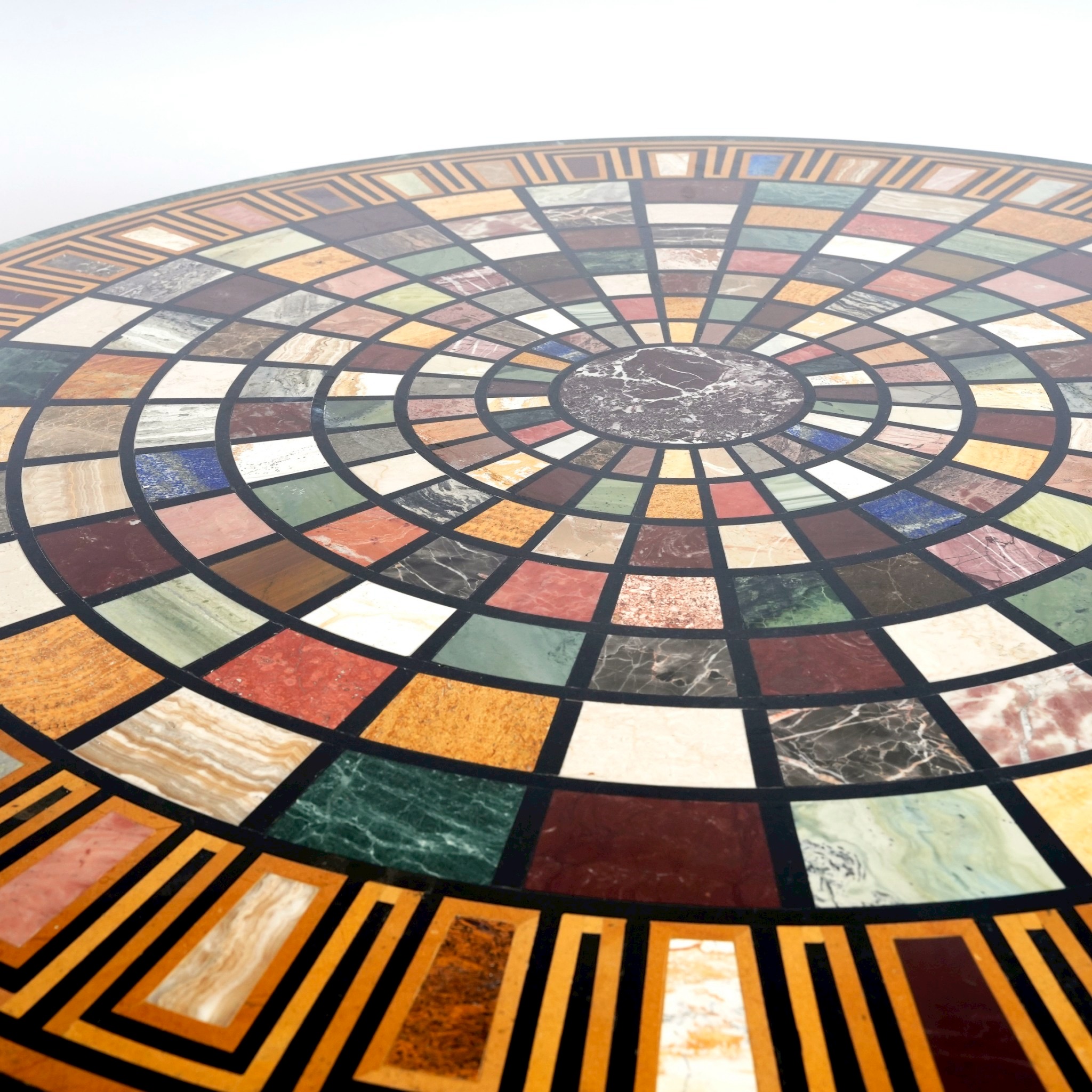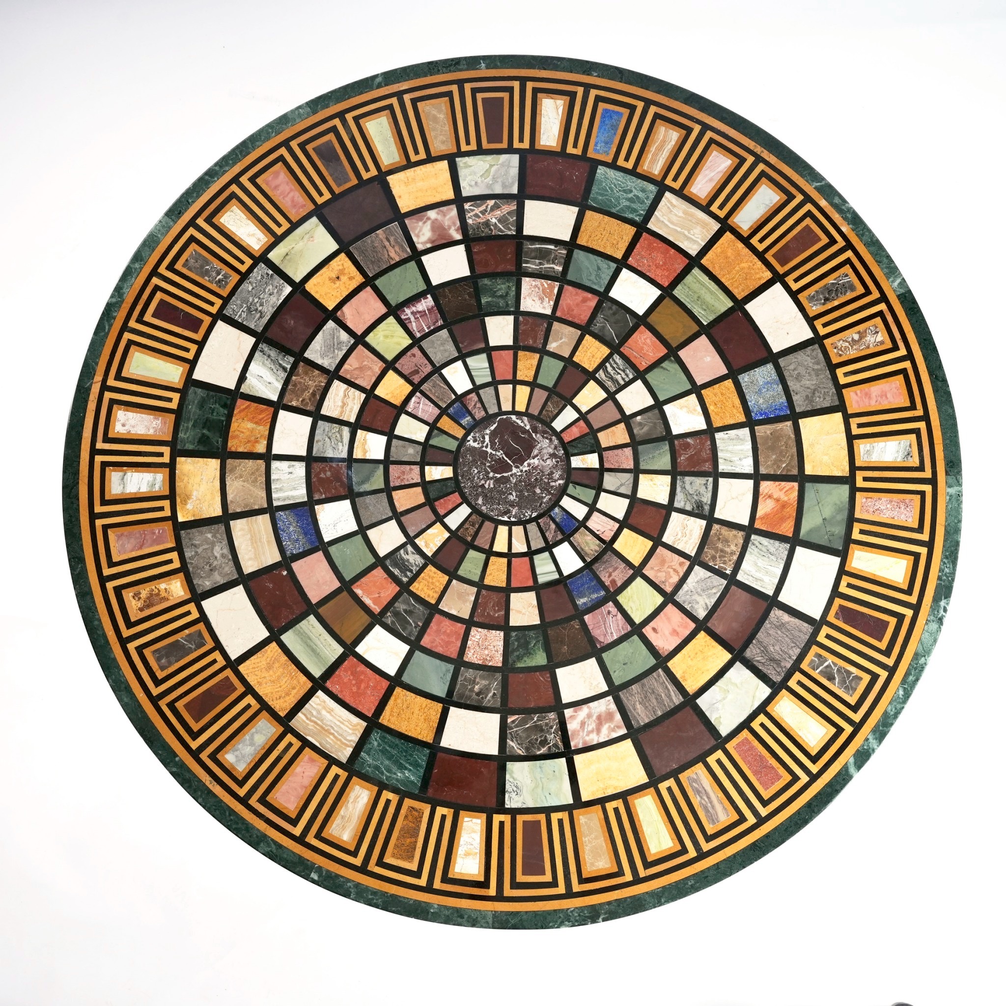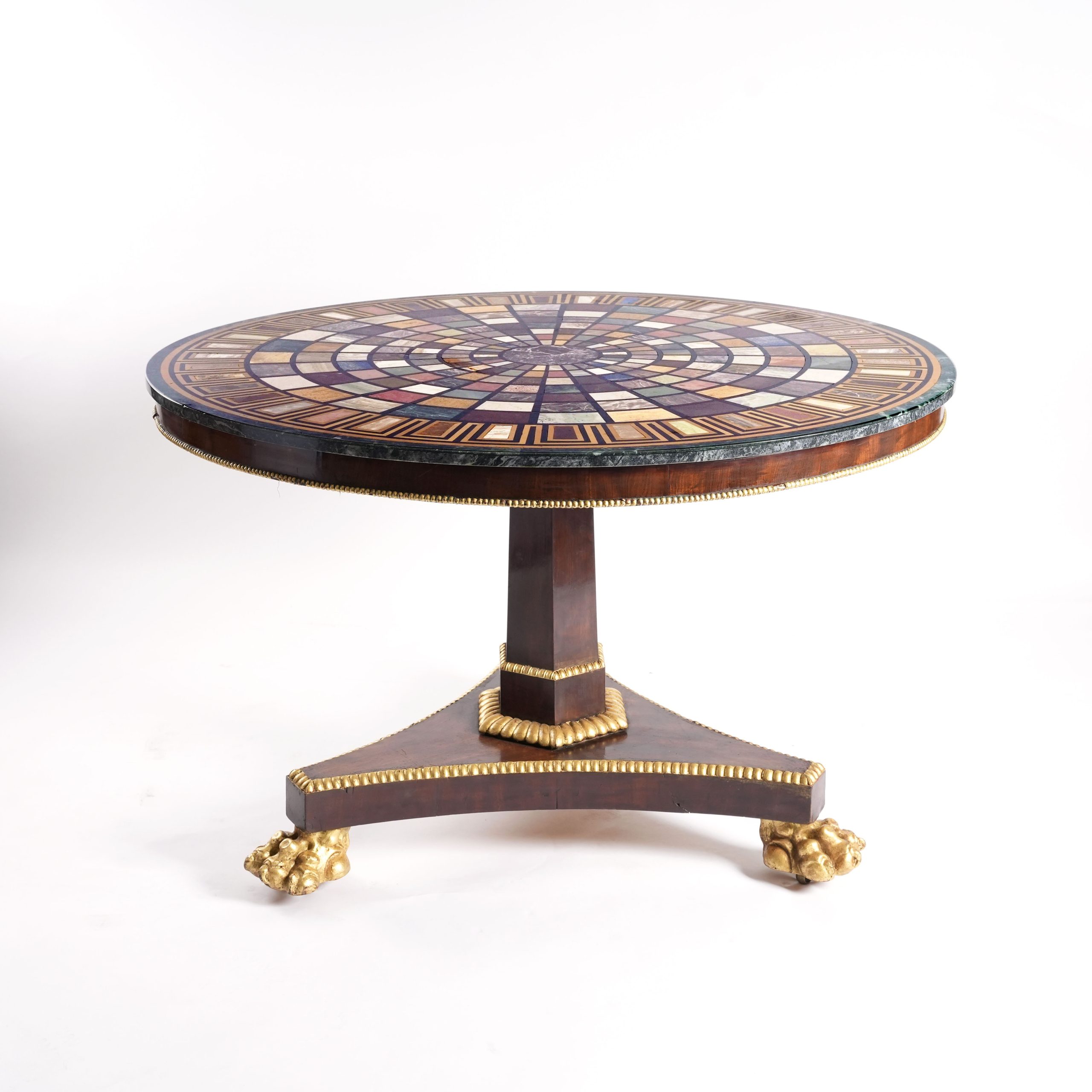 此玄關桌子採用了經典的放射同心圓狀幾何鑲嵌(Radial Geometric Inlay)圖案。它以中央深色紋路的圓形為中心,向外放射出多層同心圓環,每格都嵌入不同的石材,色彩豐富,對比鮮明,完美體現了 19 世紀羅馬工匠的精湛技藝。桌子底座設計是典型的攝政風格的呈現,三足式基座(Tripod Pedestal Base)是大廳玄關桌(Centre Table)的經典形式,加上雕刻並貼上金箔的獸足(Lion Paw Feet),經典帝政風格符號,象徵力量和權威。