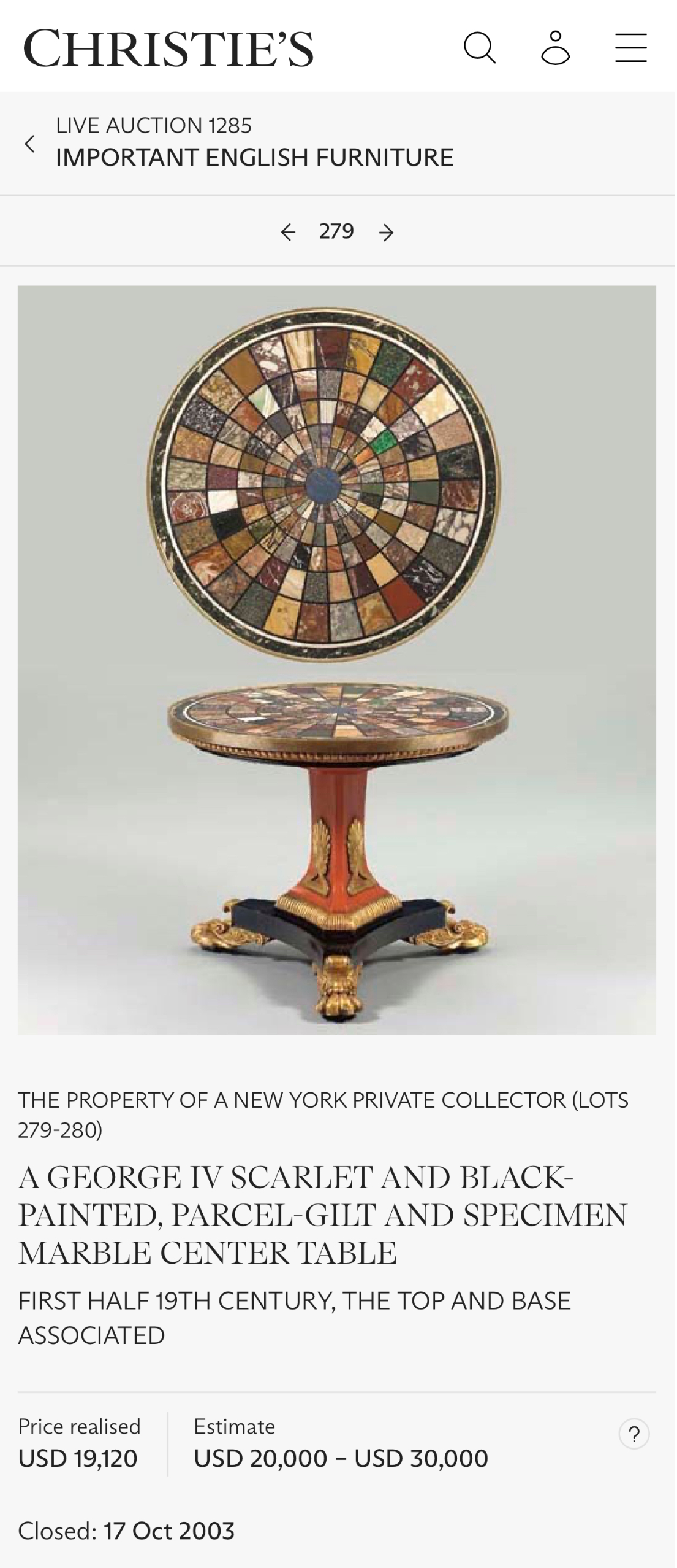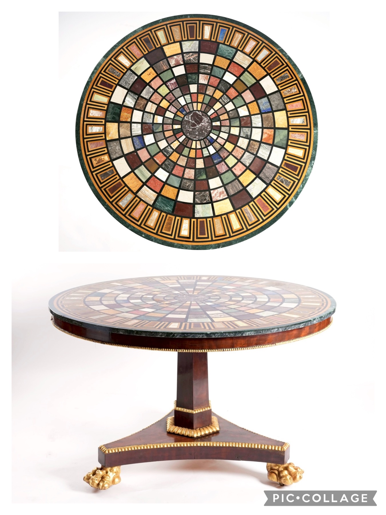 本介紹所檢附的圖片中,也包括佳士得相同類型的拍賣資訊,請特別注意拍賣年代,此類物件的價格有極大的漲幅,極具收藏價值,這類桌子不僅是傢俱,更是一件結合了地質學、歷史學和頂級工藝的藝術品。圓形桌面是這件藝術品的靈魂,它體現了 19 世紀早期歐洲對礦物學和古典藝術的狂熱。